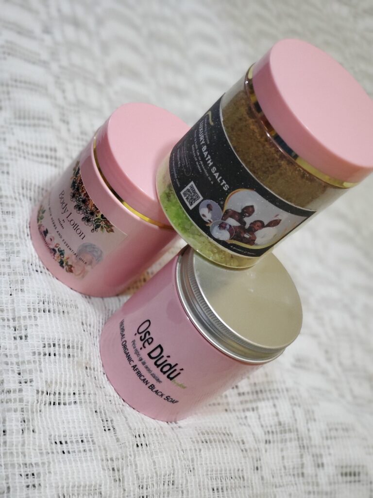Description: Herbal black soap (ose dudu), herbal body lotion and rejuvenating bath salts.